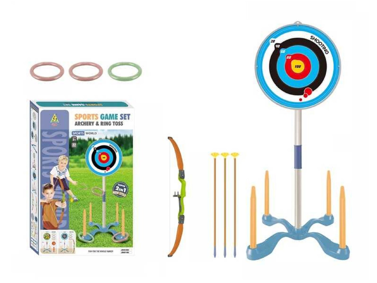 Perfect for developing physical skills in children ages 3 and up, this versatile kit includes both Archery and Ring Toss. The central target features a traditional circular archery bullseye (from 20 to 100 points) and a built-in ring toss stand. The 23-piece set comes with a green bow and a child-safe arrow, and several rings. This game fosters focus and hand-eye coordination as kids take turns shooting arrows or throwing rings in a friendly competition, all set against a fun outdoor graphic.”