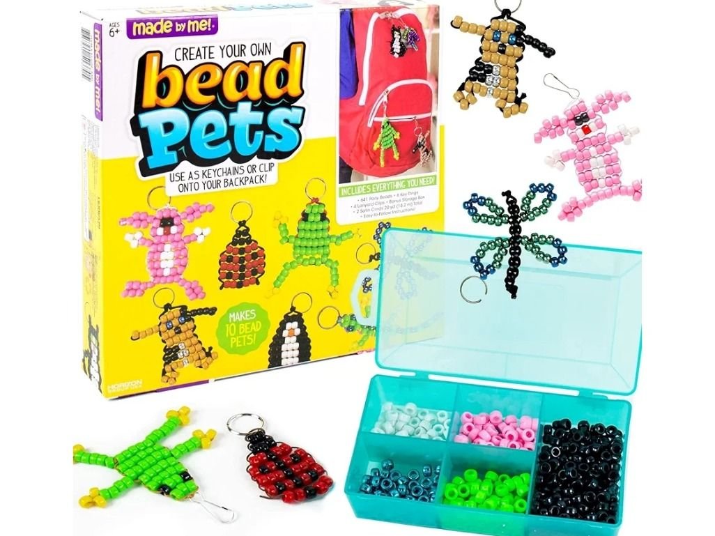 Bead Pet Craft Kit – 640+ Colorful Beads for Creative Fun! Unleash your creativity with over 640 vibrant pony beads, key rings, clips, satin cords, and a simple step-by-step instruction booklet to guide your bead pet creations. Create 10 Adorable Animals! Make cats, frogs, dragonflies, ladybugs and more — or invent your own bead pet masterpieces! Strong Metal Clips & Key Rings Perfect for turning your bead pets into bag charms, keychains, or playful accessories for keys, backpacks, or lunchboxes. Take your designs everywhere! Handy Storage & Beading Station The included case keeps everything organized and doubles as a compact, travel-friendly workspace. The Perfect Gift for Kids & Craft Lovers! Encourages creativity, builds fine motor skills, and provides hours of screen-free fun — great for birthdays, holidays, or everyday play! What’s Inside: 641 Colorful Pony Beads 6 Metal Key Rings 4 Lanyard Clips 2 Satin Cords (10 yards each) 1 Storage Case (7 in. X 3.75 in. X 1.5 in.) Easy-to-Follow Instruction Booklet