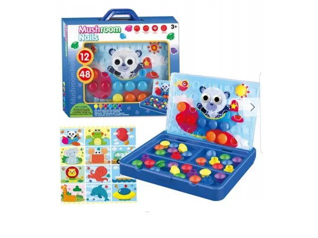 - Logic Training: The fun matching game helps children develop their observation skills by watching the colors on the inserted cards and then placing the matching mushroom nails to match those colors.