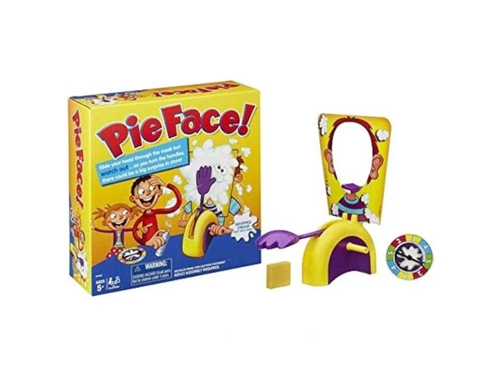 Get ready for the hilarious **Pie Face** game that might just splat you in the face. The pie-throwing arm could go off at any moment, adding to the suspense. Score a point every time you turn the handle without getting splatted. Included in the set: – One pie thrower – One throwing arm – One whipped cream spray – Two handles – Chin rest – Splash guard mask – Spinner – Sponge Slide your head through the mask, hold your breath, and watch out! This game is packed with fun and surprises, and someone’s bound to get a pie in the face. Who will it be.