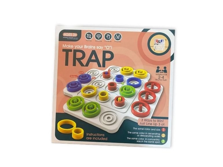 Smart trap game: a fun challenge to ignite your competitive spirit! The smart trap (TRAP)game is an exciting strategy game suitable for children aged 3 and up, designed for 2 to 4 players. Learn to plan and think logically as you cleverly arrange the rings to win in one of three ways! ?? 3 ways to win: – Match by color and size – Match by color in ascending or descending order – Match by color with interlocking sizes in the same spot ?? Develops: – Concentration skills – Logical reasoning – Social interaction ?? safe and easy to use: Perfect for family game nights and friendly competitions. ?? instructions included: Comes with easy-to-follow instructions in the box. One game, countless ways to win… will you fall into the trap?