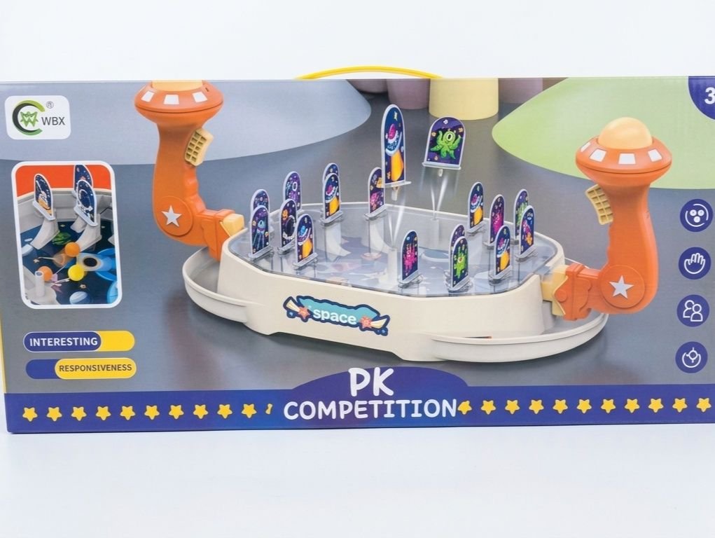 Its an out of this world competition The Space PK Challenge features a dynamic unfolding alien shooting arena where two players can go head to head Equipped with powerful UFO shaped popper blasters and star motif handles players aim to target the colorful alien and spaceship illustrated targets to score points The set includes multiple foam balls ensuring hours of dynamic action It encourages hand eye coordination quick responsiveness and friendly competition”