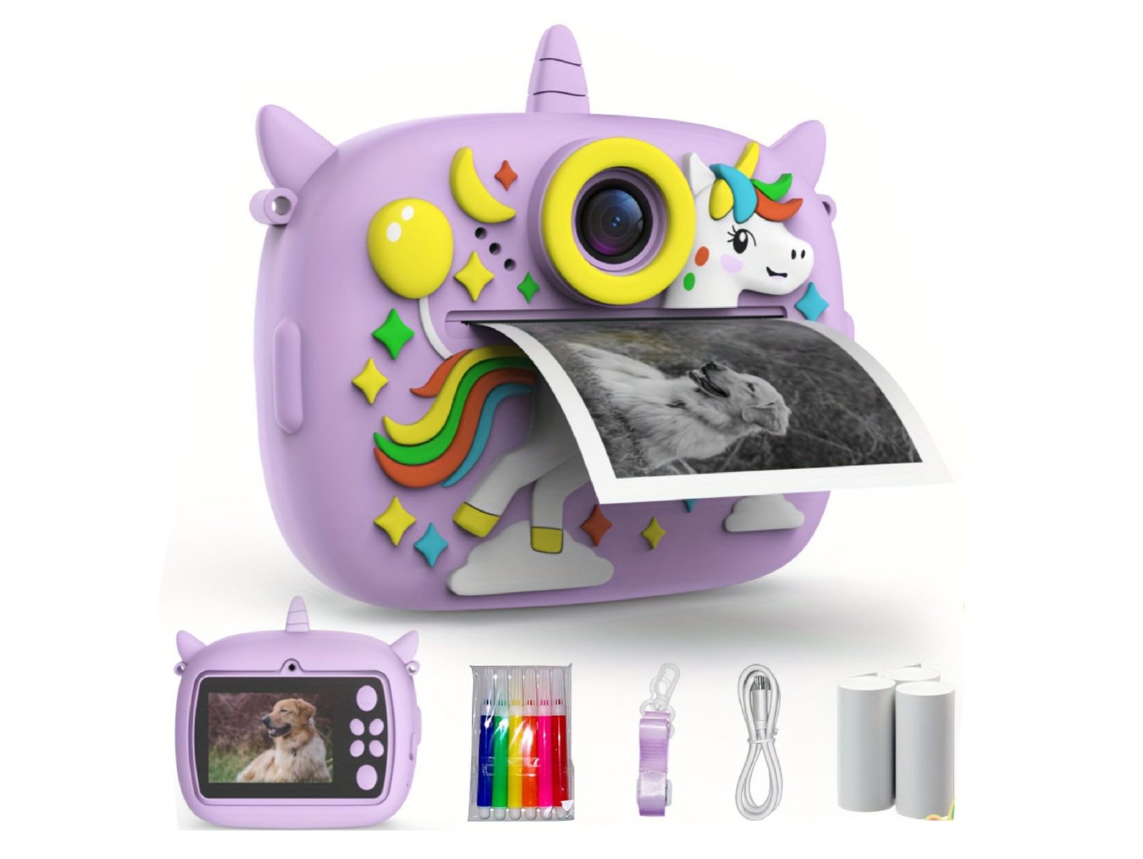Capture and print memories instantly with this adorable Unicorn-themed Digital Mini Camera! This 3-in-1 device allows children to take high-quality photos, record videos, and print black-and-white thermal photos on the spot. It also comes pre-loaded with fun games and music. The package includes colorful markers so kids can personalize their printed photos, making it the perfect creative companion for young explorers.