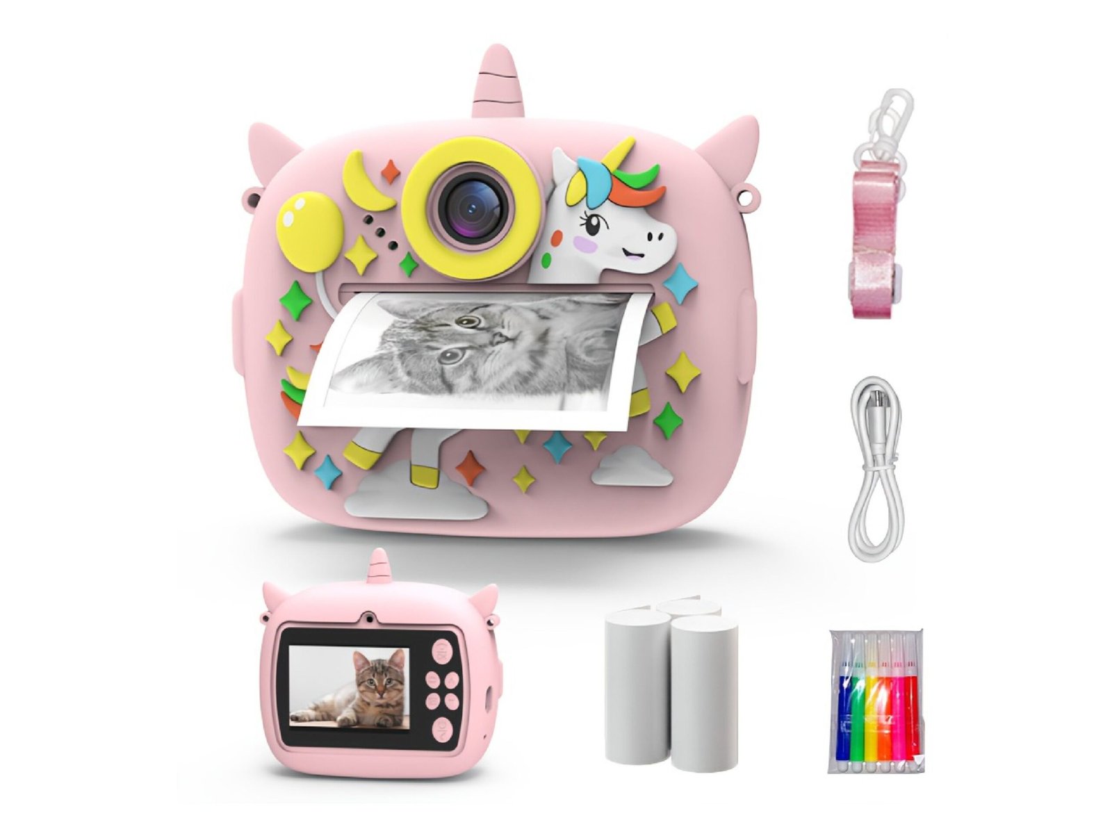 Capture and print memories instantly with this adorable Unicorn-themed Digital Mini Camera! This 3-in-1 device allows children to take high-quality photos, record videos, and print black-and-white thermal photos on the spot. It also comes pre-loaded with fun games and music. The package includes colorful markers so kids can personalize their printed photos, making it the perfect creative companion for young explorers.